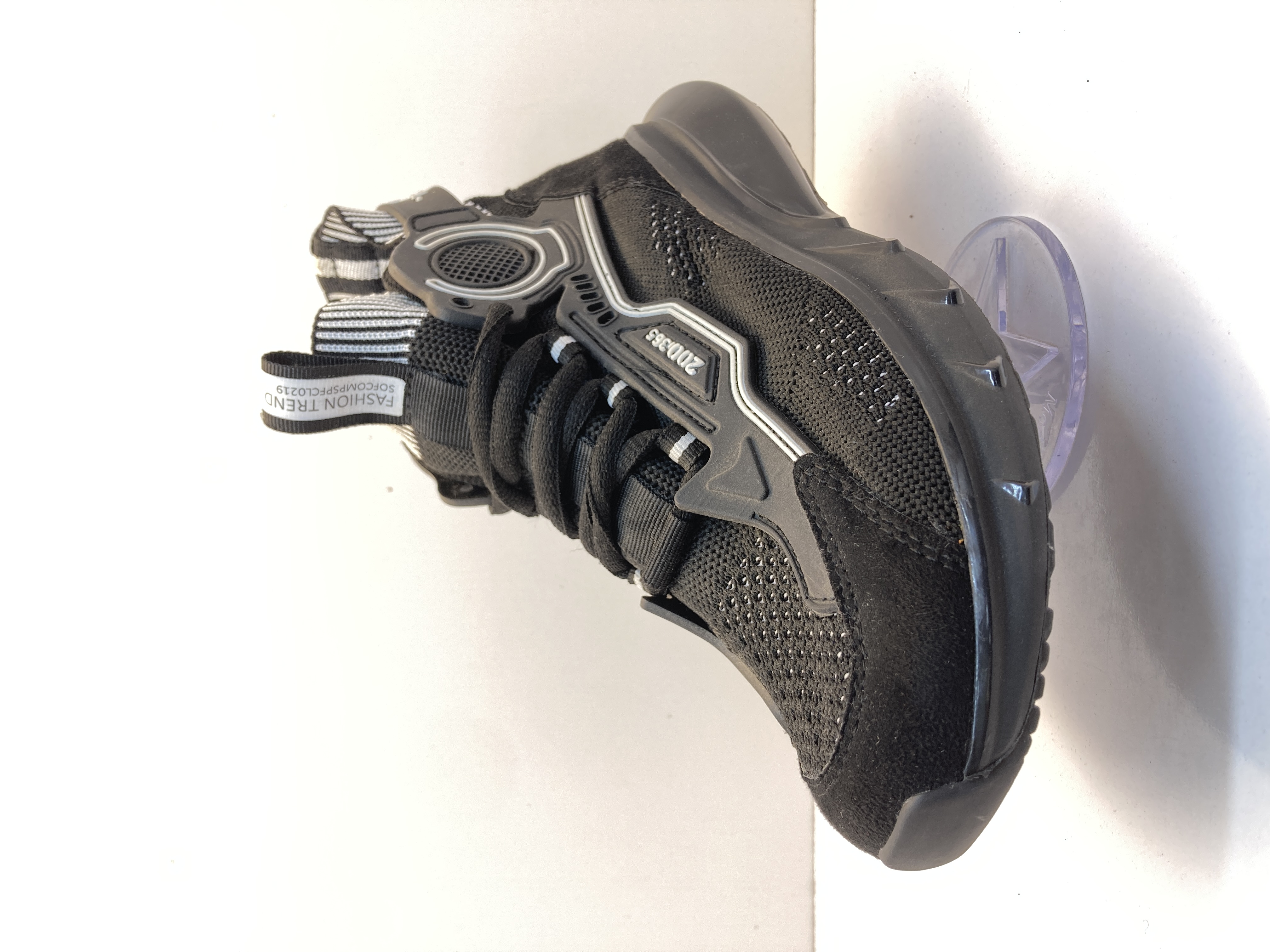 رنگ: مشکی با جزئیات طوسی/نقرهای مدل: ساقدار (High-top) سبک: اسپرت / خیابانی (Streetwear / Casual / Urban) طراحی: مدرن و آیندهنگر (Futuristic) جنس و متریال: رویه: ترکیبی از پارچه مش (Mesh) تنفسی جیر مصنوعی یا مخمل صنعتی در قسمت جلو و کنارهها متریال پلاستیکی تقویتی در بدنه کناری کفی میانی: فوم ضخیم با طراحی حجمی (ضربهگیر) زیره: لاستیکی مقاوم با آج اسپرت